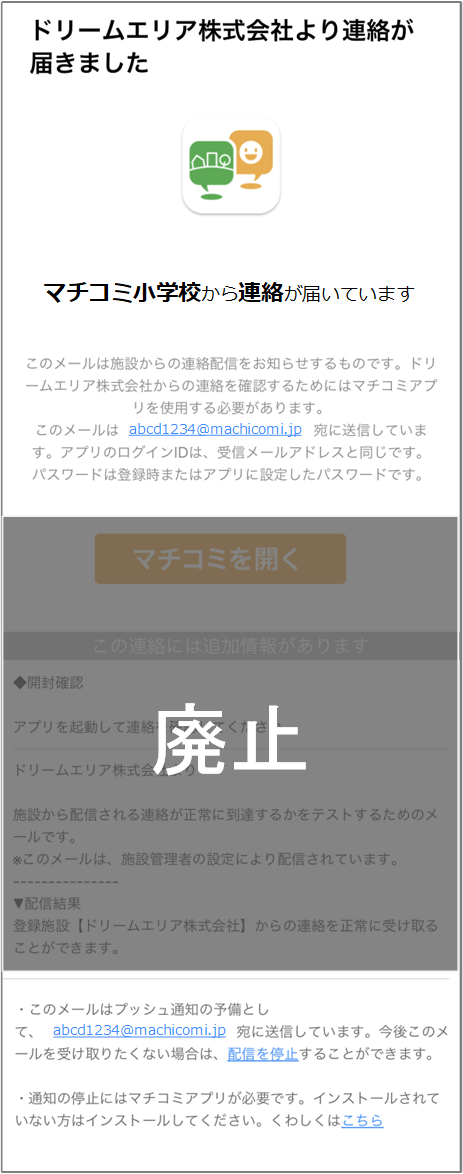 また、一部の機種において、通知メール内の「マチコミを開く」ボタンからのアプリ起動が正常に行えない状況が確認されていたため、併せて「マチコミを開く」ボタンを廃止させていただきました。