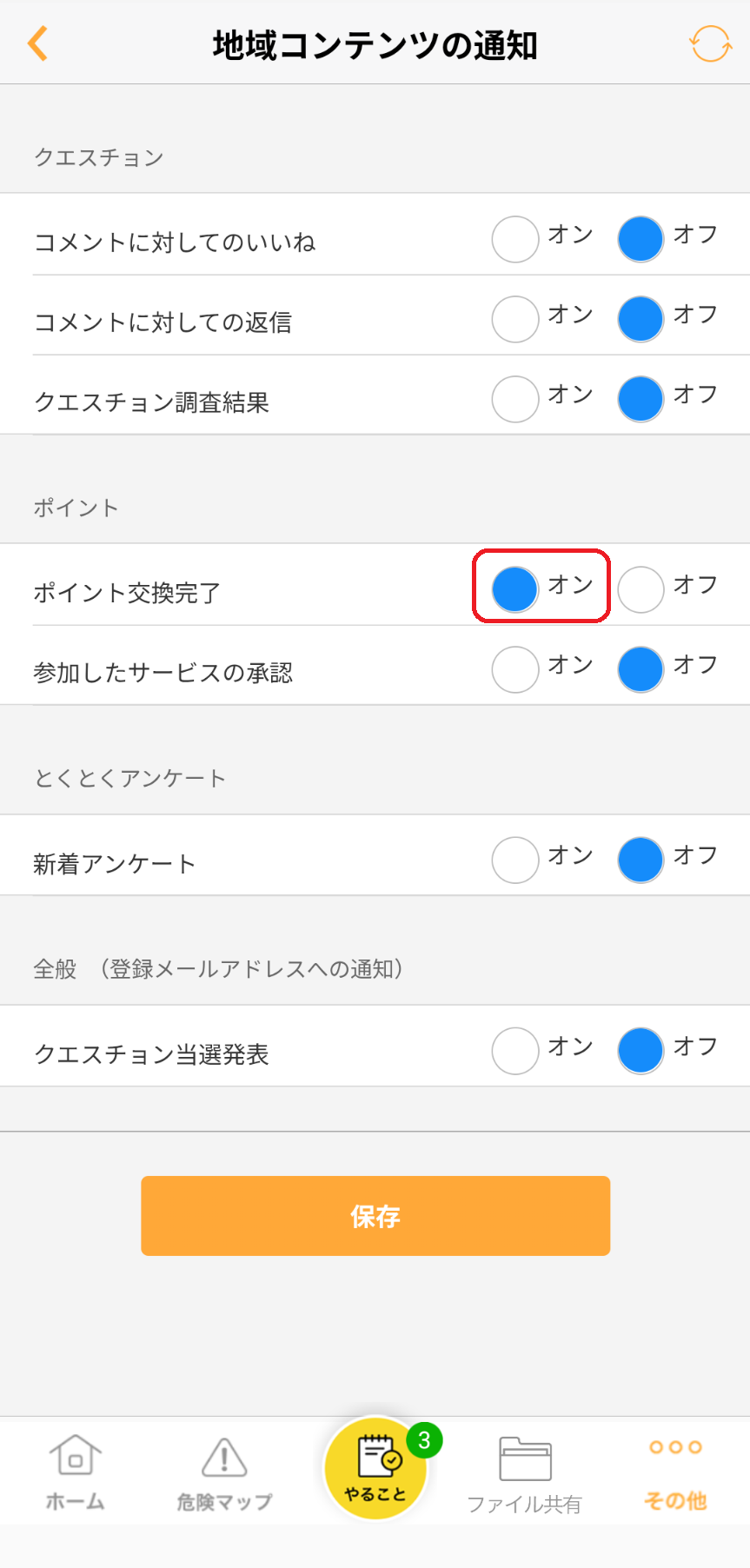 手順3 [ポイント交換完了]を[オン]に変更し、[保存]をタップして設定完了