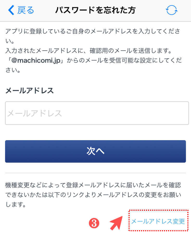 ❹利用できなくなった登録メールアドレスとPINコードを入力し「次へ」をタップ