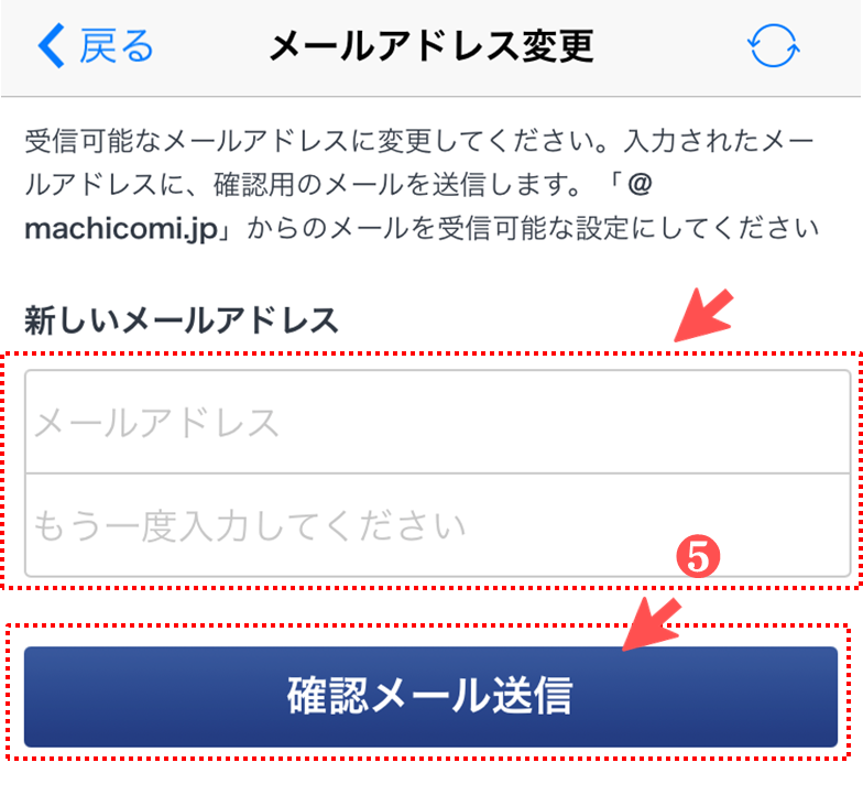 ❺新しいメールアドレスを入力し「確認メール送信」をタップ